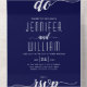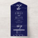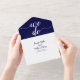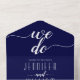 "We do" elegant navy blue and white cursive script handwritten style calligraphy navy and white wedding all in one invitation.