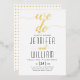 "We do" real gold foil wedding invitation with lovely cursive script handwritten style calligraphy. A gold and white geometric pattern covers the back.