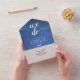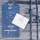 "We do" elegant stained blue and white cursive script handwritten style calligraphy wedding all in one invitation.