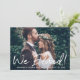 Announce your elopement in style with this brush script photo wedding announcement. A bold "We Eloped!" headline in white brushstroke lettering overlays your favorite photo on the front, with names and date beneath. The back features a second photo alongside a customizable letter sharing the story of your private ceremony. Replace the photos and edit all text to make it completely your own.