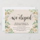 Plain white envelopes are included with paper invitations and will come to fit the invitation size you select. If you don’t need the envelopes, you may choose to not receive them by selecting the dropdown below "Envelopes" and choosing "None." If you’d like to have a design on your envelopes, you can browse all of these available envelopes to find the design that complements your We Eloped Elopement Reception Invitation Card.