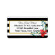 You can edit the display text that says "We Have Moved" in the black script. Also, you can personalize your label your name and new address. Black and white stripes form the background. A red flower is on the right side.