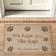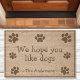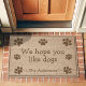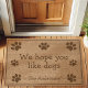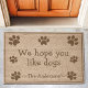 Welcome guests with a playful warning using this "We Hope You Like Dogs" doormat, featuring adorable paw prints and a customizable family name. Ideal for dog lovers and pet-friendly homes, this mat adds a warm, humorous touch to any entryway. A perfect gift for new homeowners or families with furry friends.