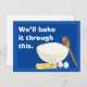 A postcard showing smiling food ingredients, a bowl of flour, eggs, butter, and a wooden spoon. The characters are standing together, with the words “We’ll bake it through this”. This cute food postcard can be sent to anyone you want to encourage through a tough time, with a smile.