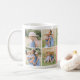 This modern custom photo mug features a collage of 9 square photo spaces and custom "We Love You Mommy" white wording with heart accent and names of grandchildren on a pretty pink background. Colors and wording can be completely personalized. Makes a thoughtful and sweet Mother's Day keepsake gift for the super mom in your family.