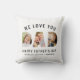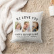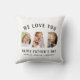 We Love You arches above bold DAD letters filled with three personalized photos, with Happy Father's Day and customizable children's names below on a clean white background. This fun, modern photo pillow makes a memorable Father's Day gift the whole family can help create. Upload your own photos and edit the names to personalize.