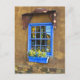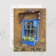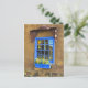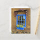 Customize this postcard. A bright cobalt blue, french style window on an adobe and rock wall. Santa Fe, New Mexico. Photography by Minerva Bloom.