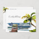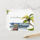 A tropical watercolor palm tree bends over the water on this southern or Florida themed new address announcement postcard. The scene also includes a wooden dock, for those lucky enough to now live in a waterfront home, whether intracoastal or lakefront. All example text on front and back of the card can be easily revised with your personal greeting and contact details.