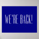 A simple yet bold blue poster that states, “WE’RE BACK” to be displayed for a business, organization or group that has been temporarily closed. A great poster that can be placed in a store window to let everyone know that you’re back in business.