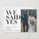 The front of the card is designed to showcase your favorite vertical orientation photo, with the words 'We Said Yes' at the left in a black, timeless and elegant fashion magazine typography. Your names, wedding date and location appear at the bottom left in a modern, fashion sans serif font.