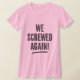 Minimalistic bold text “We screwed again ” in capital letters, centered, clean typography, ideal for T-shirt print.