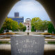 Image shows the Memorial Cenotaph at the Hiroshima Peace Memorial Park with the inscription 'Let all the souls here rest in peace for we shall not repeat the mistake.'