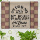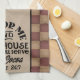 These cute primtive style kitchen towels are just perfect for your country home. Decorative typography reads "As for me and my house we shall serve Hot Cocoa.. Winter 24.7". It is set against a creamy tan background. The towel is then bordered by a rustic barn red and an earthy tan color check.