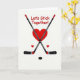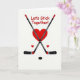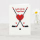 This Valentine’s Day card celebrates love with a fun hockey twist. At the center, two hockey sticks cross neatly, black with red tips and gray handles, forming a strong frame around a bold red heart. Below the heart sits a classic black hockey puck, with two smaller red hearts nearby for balance and warmth. The white background helps the red and black colors stand out clearly. Above the design, the message “Let’s Stick Together!” appears in a casual red handwritten style, adding charm and meaning. Subtle details, like the shine on the puck and the markings on the sticks, give the card depth while keeping the focus on love, teamwork, and staying close.