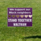 This is a double sided lawn sign, with the same message on each side. We stand together against racism. Based out of Waltham, Massachusetts, our goal is to flood the streets of our community with lawn signs showing support for our Black neighbors. Join us in spreading this important message and tackling the ongoing work to make our city a welcoming, accepting, and affirming community for all of our residents. All proceeds will be donated to the Waltham Black Future Fund.
