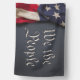 Words of the US Constitution "We the People" written on a chalkboard with a vintage American flag border