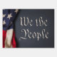 Words of the US Constitution "We the People" written on a chalkboard with a vintage American flag border