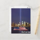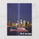 This graphic features the Manhattan skyline in New York City. The image was taken at night and the blue glow of the World Trade Center memorial is lighting up the sky and reflecting in the water below. On the surface of the water an American flag has been superimposed with the words 'We will never forget' written in white text underneath it.