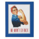 Women's Rights protest wall art features full color vintage style Rosie the Riveter graphic and "we won't go back" text .