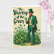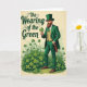 This St. Patrick's Day card features a well-dressed gentleman in an emerald green suit, top hat, and tie, standing slightly off-center as he offers a small three-leaf shamrock with an inviting, friendly gaze 💚. His neatly trimmed auburn beard and bright blue eyes add a gentle charm, like he’s sharing a quiet toast with someone close. Around him, a carpet of shamrocks in mixed green tones spreads across the bottom, creating a cozy, festive setting ☘️. The background is a creamy beige with faint, drifting shamrock shapes that add depth without stealing attention. In the upper left, the title “The Wearing of the Green” sits in dark green lettering, angled to draw your eye across the scene. Warm light softens the greens, while a tan waistcoat and polished brown shoes bring in earthy contrast, and a brown flask peeks from his pocket. The shamrock field layers from deeper greens near his feet to lighter leaves toward the edges, with pale shamrock silhouettes floating behind him.