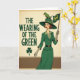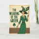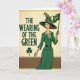 This design shows a vintage-style scene where a poised woman in an emerald green outfit stands to the right against a warm, creamy background, her posture calm and confident. She wears a wide-brimmed green hat trimmed with small leafy details, and a green parrot rests there like a close companion, leaning in as if sharing a quiet secret 💚. In her raised hand she holds a small green flag marked with a gold “W,” the metallic tone catching the light and drawing the eye. On the left side, large stacked lettering reads “THE WEARING OF THE GREEN” in dark green, arranged like a classic poster headline. A shamrock sits just beneath the phrase as an underline, echoing the parrot and the hat’s foliage ☘️. The greens range from deep emerald to softer moss tones, giving the scene a gentle, dressy look that feels friendly and a little romantic in the way the bird nestles close. The woman’s outfit is sharply tailored with smooth shading, and the cream backdrop stays open and uncluttered behind the dark green title and the small shamrock mark.