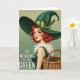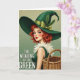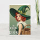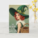 This St. Patrick's Day card features a confident young woman in a forest-green, wide-brim hat with a pointed crown, trimmed with a chartreuse bow and matching feathers. Copper curls spill from beneath the brim, framing emerald eyes and ruby lips against porcelain skin with softly rosy cheeks, and her steady gaze feels like it’s meant for someone special. She wears a deep green sleeveless gown topped with a fluffy white collar, the soft texture standing out against the smooth fabric as she holds a golden-brown wicker basket close to her side. The basket’s warm weave adds a cozy, down-to-earth touch, like she’s bringing a small gift to a dear friend. Behind her, the background is an antique sage green with a lightly worn, poster-like finish that keeps the scene calm and nostalgic. On the left side, the phrase “THE WEARING OF THE GREEN” appears in a classic serif typeface, set in a darker green that’s easy to read. Small touches of green throughout the hat, dress, and lettering tie everything together with a festive wink 💚☘️. The chartreuse bow and feather accents sit near the top of the hat, with the text aligned along the left margin against the muted green backdrop.