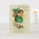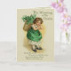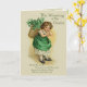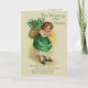 Vintage design features a young Irish girl with a basket of Shamrocks on her back. This wee Colleen is dressed in green with shamrock patterned petticoat showing. Design has been hand retouched. Front text says... The Wearing of the Green and Verse. Inside.