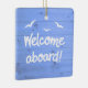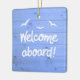 Weathered Blue Wood Welcome Aboard Nautical Ceramic Ornament. Great gift idea for the boat or yacht owner. For the beach house or coastal home. The words Welcome aboard in white, with white seagulls flying above. On a blue weathered wood background. Just like boat decking.