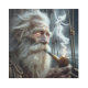 An old seaman with a long white beard and deep wrinkles gazes up at a woman's shape dancing from his smoking pipe