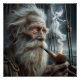An old seaman with a long white beard and deep wrinkles gazes up at a woman's shape dancing from his smoking pipe