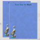 A painted, carved wooden duck with her duckling, heavily weathered, on a blue background. Customize by adding your own text.