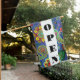 A friendly and welcoming open flag with a hand drawn whimsical paisley and flower background. A full rainbow of colors make this flag especially eye catching.