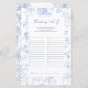 Add timeless charm to your bridal shower with this elegant Wedding A to Z game sheet, designed to coordinate with our Blue Toile Bridal Shower Suite. Inspired by classic French toile de Jouy patterns, this card features delicate blue florals and vintage styling for a refined, “something blue” celebration.