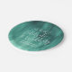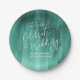 Emerald green modern abstract art painted wedding paper plates. Typographical text reads Eat, drink & celebrate the wedding of then add your own names underneath. A great personalized addition to your wedding buffet or party tables. Other matching items and colors available in this design. © Original watercolor art and design by Sarah Trett for www.mylittleedenweddings.com
