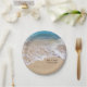 Couples names with wedding date and starfish on tropical beach sand with turquoise ocean water.