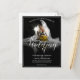 Wedding announcement with a picture of a dreamy bride sitting with a yellow bouquet of flowers in the penumbra - classic style.