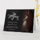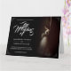 Wedding announcement with the image of a dreamy bride leaning against a wall with a bouquet of white flowers in the penumbra - classic style.