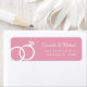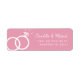 A set of custom Blush Pink address labels featuring fancy sketch style writing and a set of white wedding bands.