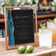 An elegant sign for your wedding bar menu. The words "bar menu" appears in dusty rose handwriting calligraphy with swashes at the beginning and end, with customizable text below. A teal blue watercolor agate design trimmed with rose gold faux glitter decorates the left border on a slate black background. See our collection for matching wedding invitation suite and day-of stationery.