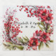 Pretty champagne labels a wreath of red flowers, red berries, sticks and twigs. Add your names and wedding date.