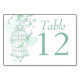 Beautiful graphic two love birds on a open bird cage art wedding table number card in green teal, mint and white. A great idea to help guests find their seats at your wedding. Personalize with your names and wedding date. Original design and bird art by Sarah Trett.