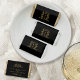 Thank your guests by adding to your tables or favor bags a personalized chocolate bite. Black and gold colored crown monogram design that can be customized with your own name, initials and wedding date. Chocolate wrap art was created from an original hand heart crown crest drawings by Sarah Trett for www.mylittleedenweddings.com