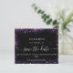A modern and elegant Save the Date for a wedding. A black background decorated with purple faux glitter. sparkles. Personalize and add a date and names. The text: Save the Date is written with a large trendy hand lettered style script.