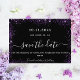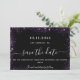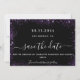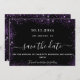 A modern and elegant Save the Date for a wedding. A black background decorated with purple faux glitter. sparkles. Personalize and add a date and names. The text: Save the Date is written with a large trendy hand lettered style script.