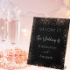 A black background, decorated with rose gold faux glitter sparkles. With the text: Welcome to The Wedding of. Personalize and add your names.