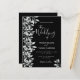 A trendy wedding invitation in black and white. A chic black background on the front. Decorated with botanical white, silver colored sprigs and foliage. Modern large handlettered script, typography with the text: The wedding of. Templates for names and wedding details. White text.