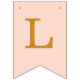 A simple bunting flags banner for a blush wedding, with the names of the bride and groom, with golden caps on blush pink background.