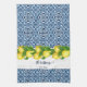 Wedding Bridal Shower Anniversary Gift personalized name tea kitchen towel. Mediterranean Amalfi coast blue tiles pattern and lemons, blue and yellow combination. Makes a lovely wedding gift, bridal shower gift, anniversary gift or any occasion special gift.