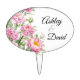 Wedding cake topper shown in a oval shape with a lovely pink peonies print with custom sample names shown in a lovely script text in a black color.