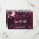 A modern and elegant Save the Date for a wedding. A deep burgundy gradient background decorated with flowers and faux silver confetti. Personalize and add a date and names. The text: Save the Date is written with a large trendy hand lettered style script.